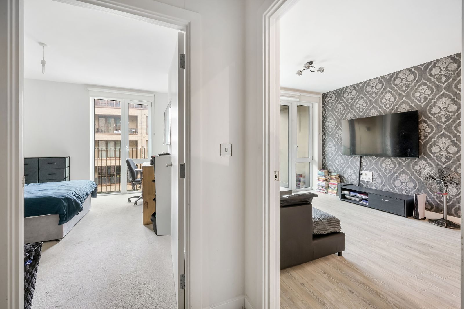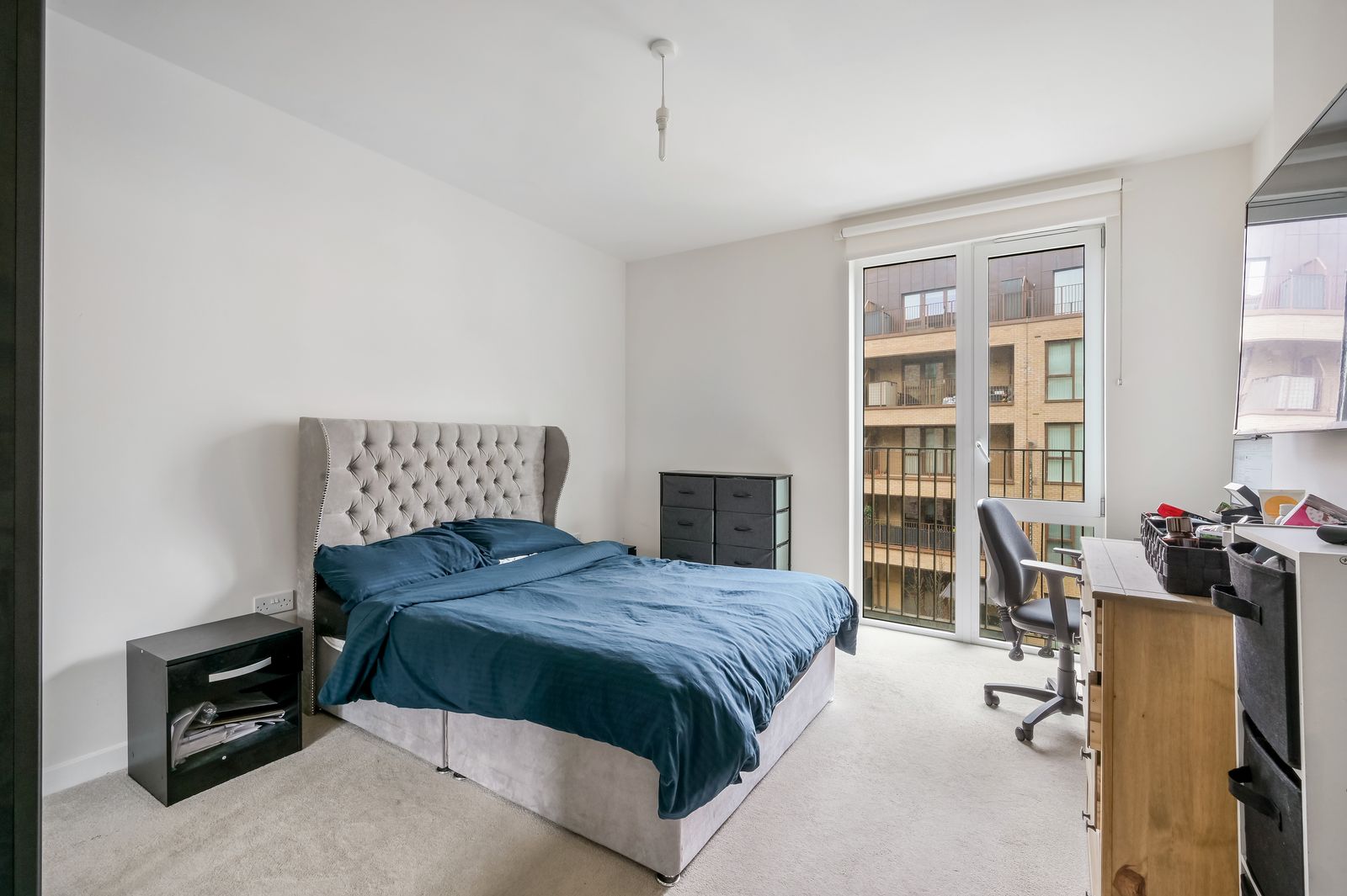 A good sized double bedroom featuring a fitted carpet, double glazed floor to ceiling casement windows to a Juliette balcony overlooking the front of the building, underfloor heating, pendant light fitting and TV, Telephone and media point.